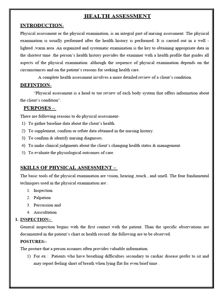 Physical assessment or the physical examination, is an integral part of nursing assessment. The physical