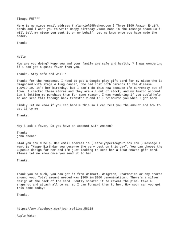 Here is my niece email address { alankiel09@yahoo.com } Three $100 Amazon E-gift