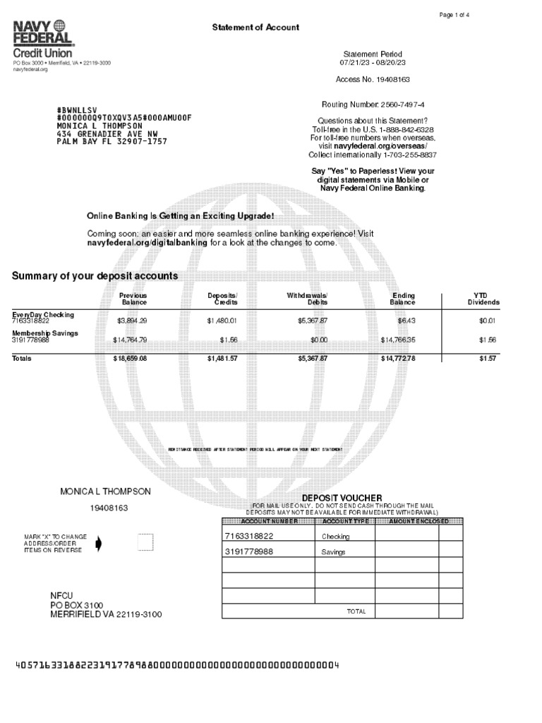 Navy Federal Credit Union, PO Box 3000, Merrifield, VA 22119-3000; or by fax, 1-703-206-4244.