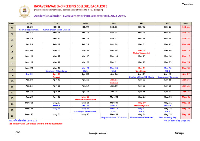 Academic Calendar: Even Semester (VIII Semester BE), 2023-2024.
