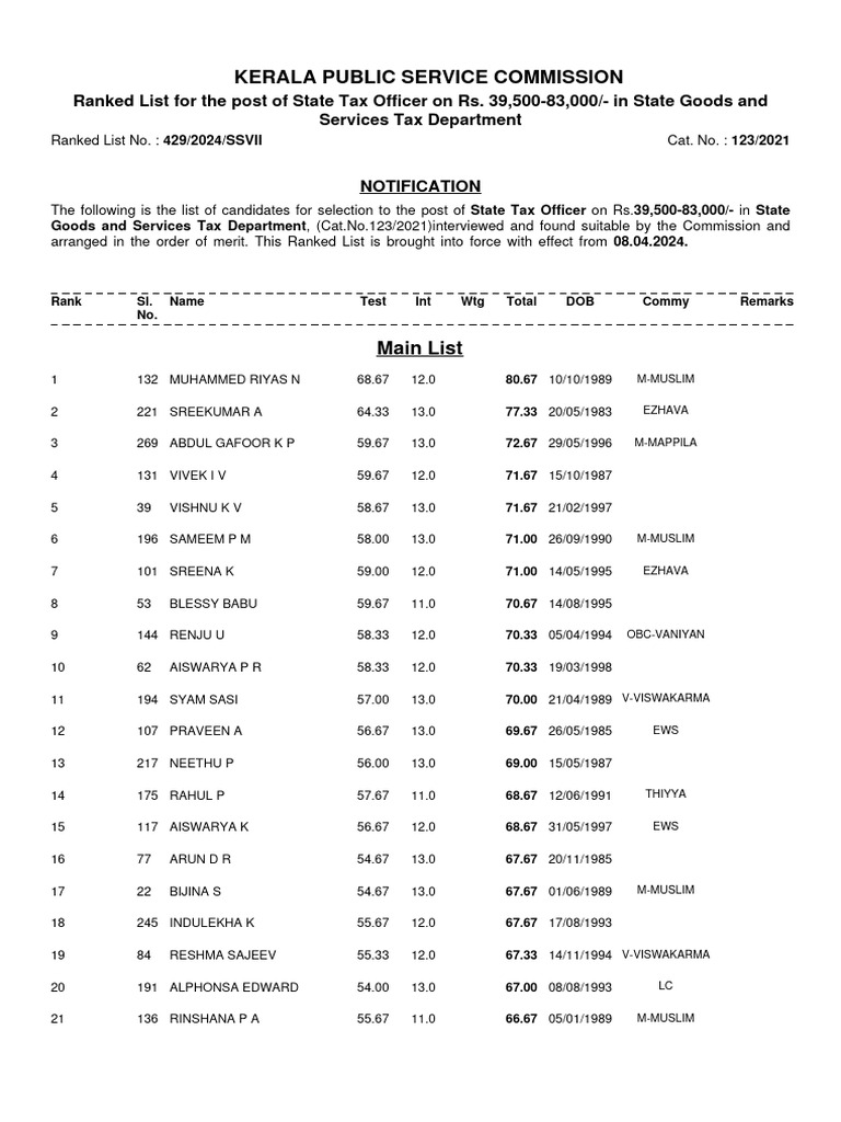 Ranked List for the post of State Tax Officer on Rs. 39,500-83,000/- in State Goods and