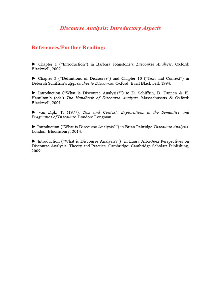 ► Introduction (“What is Discourse Analysis?”) to D. Schiffrin, D. Tannen & H.
