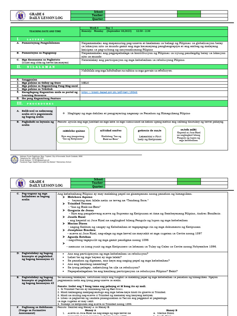 C. Mga Kasanayan sa Pagkatuto Natatalakay ang partisipasyon ng mga kababaihan sa rebolusyong Pilipino.