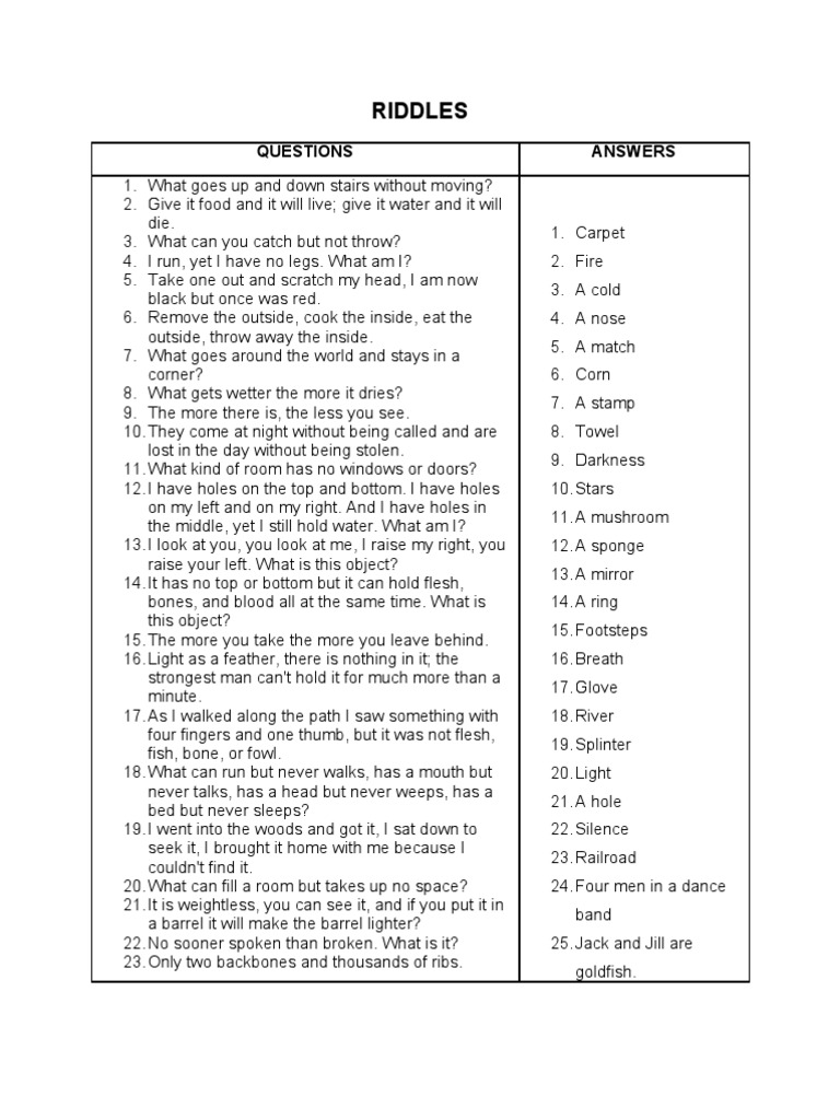 QUESTIONS 1. What goes up and down stairs without moving? 2. Give it food and it will live; give it water and it will die. 3. What can you catch but not throw? 4. I run, yet I have no legs. What am I? 5. Take one out and scratch my head, I am now black but once was red. 6. Remove the outside, cook the inside, eat the outside, throw away the inside. 7. What goes around the world and stays in a corner? 8. What gets wetter the more it dries? 9. The more there is, the less you see. 10. They come at night without being called and are lost in the day without being stolen. 11. What kind of room has no windows or doors? 12. I have holes on the top and bottom. I have holes on my left and on my right. And I have holes in the middle, yet I still hold water. What am I? 13. I look at you, you look at me, I raise my right, you raise your left. What is this object? 14. It has no top or bottom but it can hold flesh, bones, and blood all at the same time. What is this object? 15. The more you take the more you leave behind. 16. Light as a feather, there is nothing in it; the strongest man can't hold it for much more than a minute. 17. As I walked along the path I saw something with four fingers and one thumb, but it was not flesh, fish, bone, or fowl. 18. What can run but never walks, has a mouth but never talks, has a head but never weeps, has a bed but never sleeps? 19. I went into the woods and got it, I sat down to seek it, I brought it home with me because I couldn't find it. 20. What can fill a room but takes up no space? 21. It is weightless, you can see it, and if you put it in a barrel it will make the barrel lighter? 22. No sooner spoken than broken. What is it? 23. Only two backbones and thousands of ribs. ANSWERS