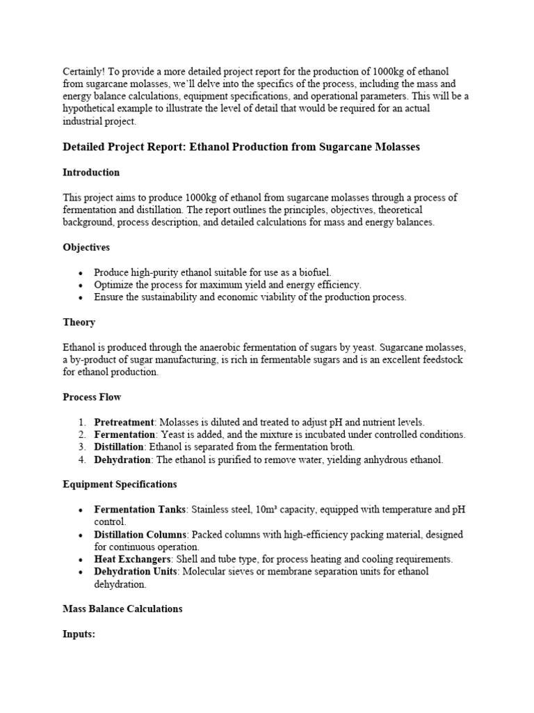 Detailed Project Report: Ethanol Production from Sugarcane Molasses