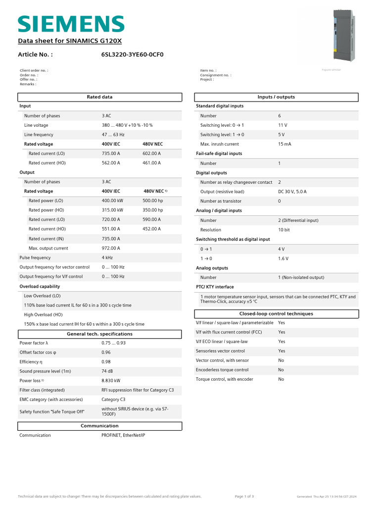 Technical data are subject to change! There may be discrepancies between calculated and rating plate values. Page 1 of 3 Generated Thu Apr 25 [Link] CET 2024