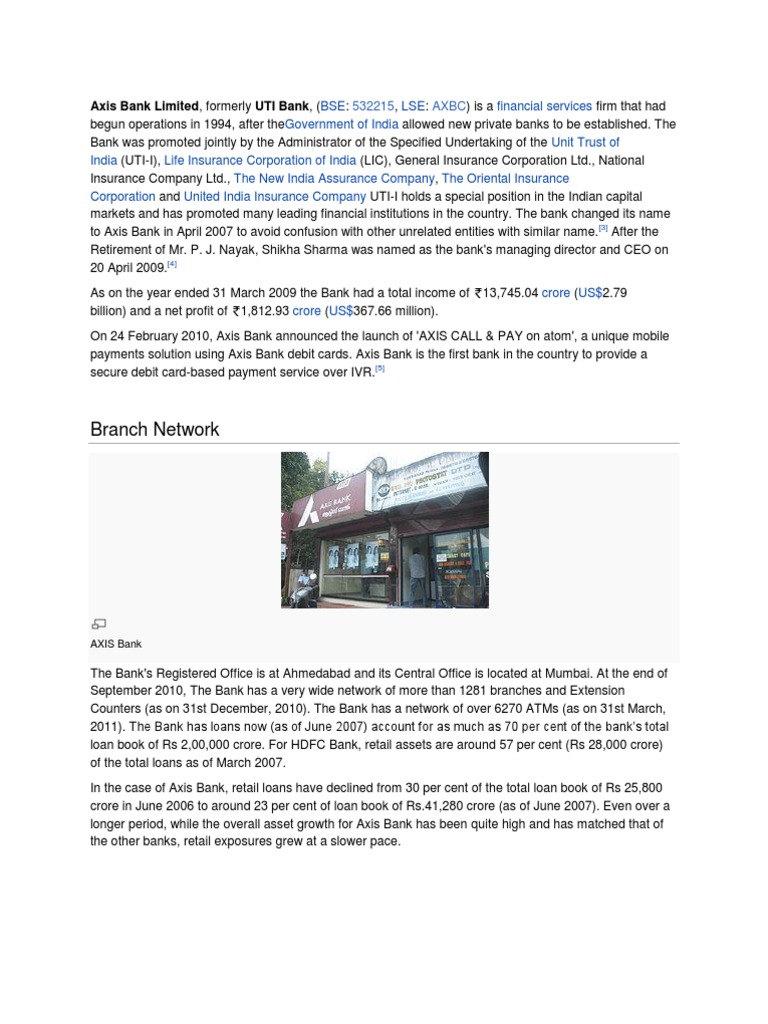 The Bank's Registered Office is at Ahmedabad and its Central Office is located at Mumbai. At the end of September 2010, The Bank has a very wide network of more than 1281 branches and Extension Counters (as on 31st December, 2010). The Bank has a network of over 6270 ATMs (as on 31st March, 2011). The Bank has loans now (as of June 2007) account for as much as 70 per cent of the banks total loan book of Rs 2,00,000 crore. For HDFC Bank, retail assets are around 57 per cent (Rs 28,000 crore) of the total loans as of March 2007. In the case of Axis Bank, retail loans have declined from 30 per cent of the total loan book of Rs 25,800 crore in June 2006 to around 23 per cent of loan book of Rs.41,280 crore (as of June 2007). Even over a longer period, while the overall asset growth for Axis Bank has been quite high and has matched that of the other banks, retail exposures grew at a slower pace.