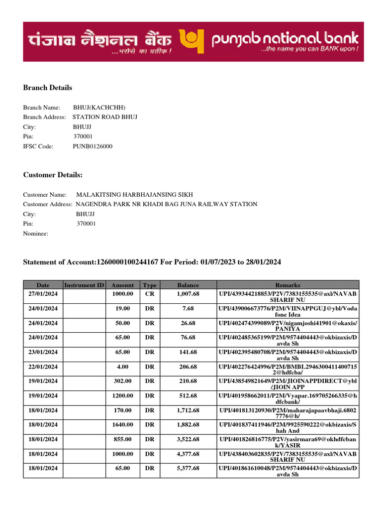 27/01/2024 1000.00 CR 1,007.68 UPI/439344218853/P2V/7383155535@axl/NAVAB