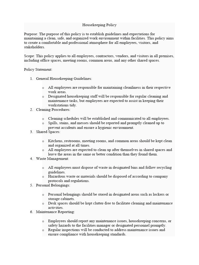 Compliance: Failure to comply with this housekeeping policy may result in disciplinary