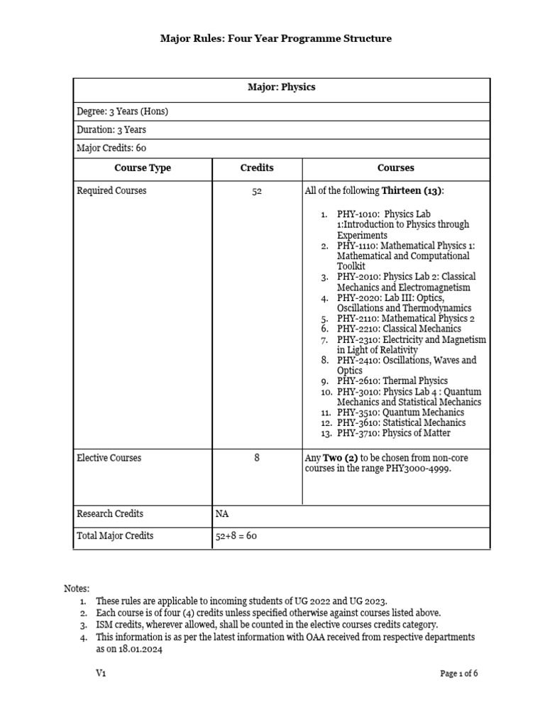 Major Rules: Four Year Programme Structure