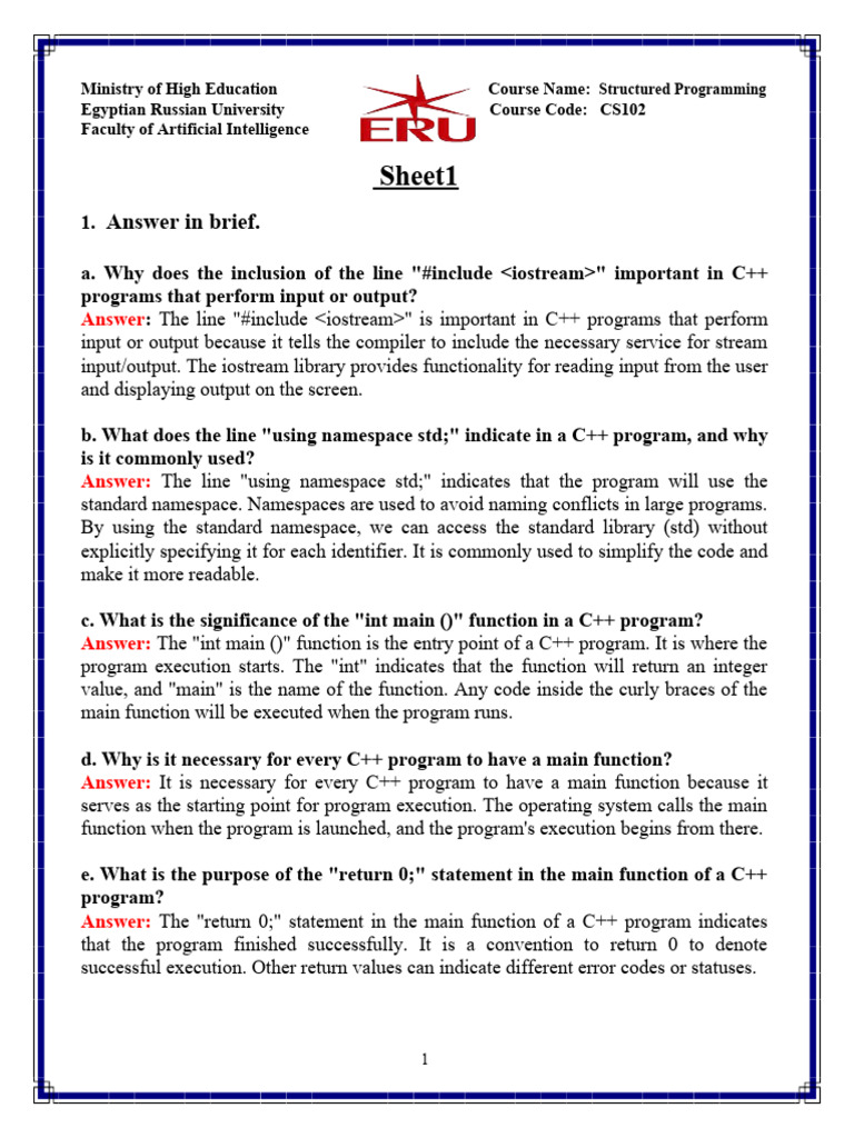 e. What is the purpose of the "return 0;" statement in the main function of a C++