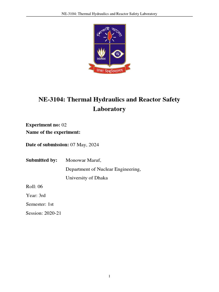 Upon completion of this laboratory assignment, as part of the course NE-3104 - Thermal Hydraulics