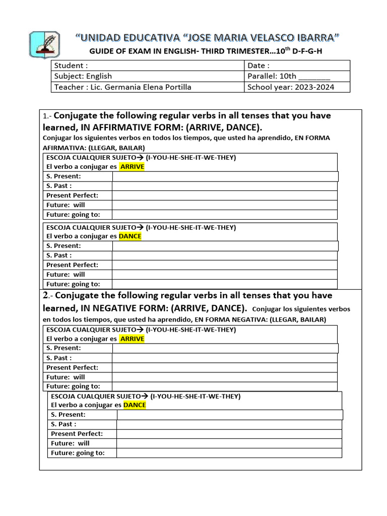 2.- Conjugate the following regular verbs in all tenses that you have