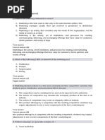 11. A market orientation recognizes that: a) Price is the most important variable for customers b) What the customer thinks he or she is buying is most important c) Selling and marketing are essentially the same thing d) Sales depend predominantly on an aggressive sales force 12. When customer expectations regarding product quality, service quality, and value-based price are met or exceeded, _____ is created. a) Customer satisfaction b) Planning excellence c) A quality rift d) A value line 13. Marketing decision makers in a firm must constantly monitor competitors' activities-their products, prices, distribution, and promotional efforts-because a) The competitors may be violating the law and can be reported to the authorities b) The actions of competitors may threaten the monopoly position of the firm in its industry c) The actions of competitors may create an oligopoly within an industry d) New product offerings by a competitor with the resulting competitive variations may require adjustments to one or more components of the firm's marketing mix 14. Toyota's Prius and Honda's hybrid Civic are examples of technological products inspired by: a) Style considerations in the Japanese automobile industry b) Social pressure to develop more fuel-efficient vehicles with fewer dangerous emissions c) The desire of many engineers to simply make interesting products d) The realization that Japanese people didn't need large, high-speed cars 15. The 'operations' in a passenger airline service would be: a) The manufacture of the aircraft b) Getting passengers and baggage from A to B by means of flying in an aircraft c) The design of the price structure and yield plan d) Selling the tickets to passengers 16. In the value chain, primary activities are: a) Directly involved in the production, marketing and delivery of the product or service b) Those activities that are all undertaken in-house c) Those activities that support the production, marketing and delivery of the product or service d) Directly involved in the production and delivery of the product or service Page 3 Marketing Management (MCQs) By: Vivek Singh Tomar (ABS)