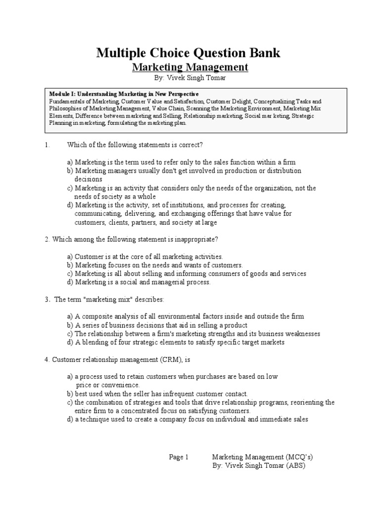 Marketing Management (MCQs) By: Vivek Singh Tomar (ABS)
