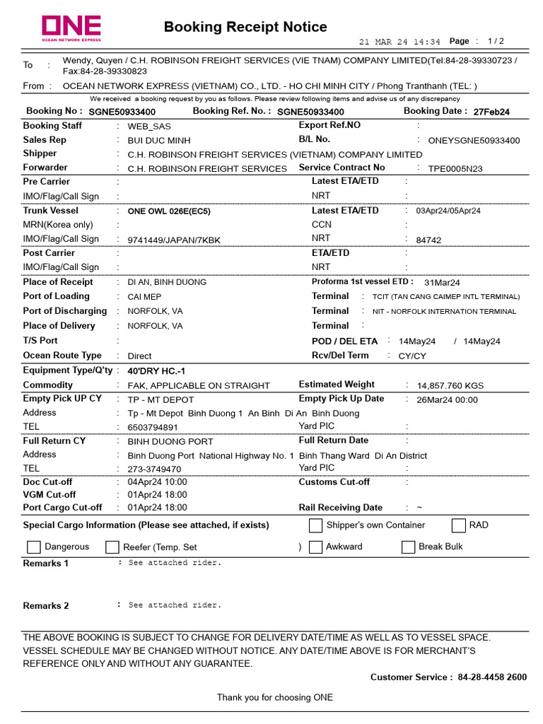 Sales Rep : BUI DUC MINH B/L No. : ONEYSGNE50933400