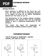 Piezoelectric Pressure Sensors. Piezoelectric elements are bi-directional transducers capable of converting stress into an electric potential and vice versa. They consist of metallized quartz or ceramic materials. One important factor to remember is that this is a dynamic effect, providing an output only when the input is changing. This means that these sensors can be used only for varying pressures. The piezoelectric element has a high-impedance output and care must be taken to avoid loading the output by the interface electronics. Some piezoelectric pressure sensors include an internal amplifier to provide an easy electrical interface (see Figure 19). Strain Gauge Pressure Sensors. Strain gauge sensors originally used a metal diaphragm with strain gauges bonded to it. A strain gauge measures the strain in a material subjected to applied stress. Consider a strip of metallic material (see Figure 20) with electrical resistance given by: