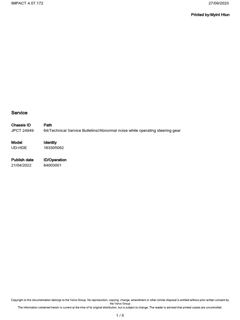 Copyright to this documentation belongs to the Volvo Group. No reproduction, copying, change, amendment or other similar disposal is entitled without prior written consent by