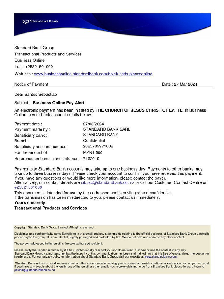 An electronic payment has been initiated by THE CHURCH OF JESUS CHRIST OF LATTE, in Business
