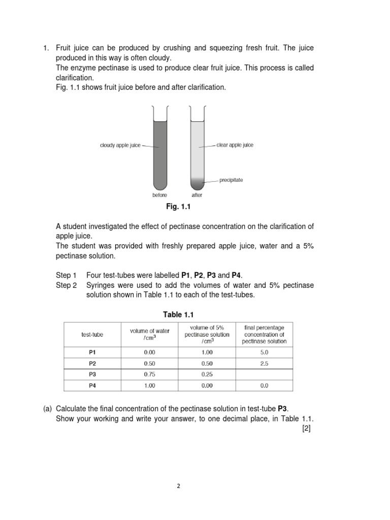 (a) Calculate the final concentration of the pectinase solution in test-tube P3.