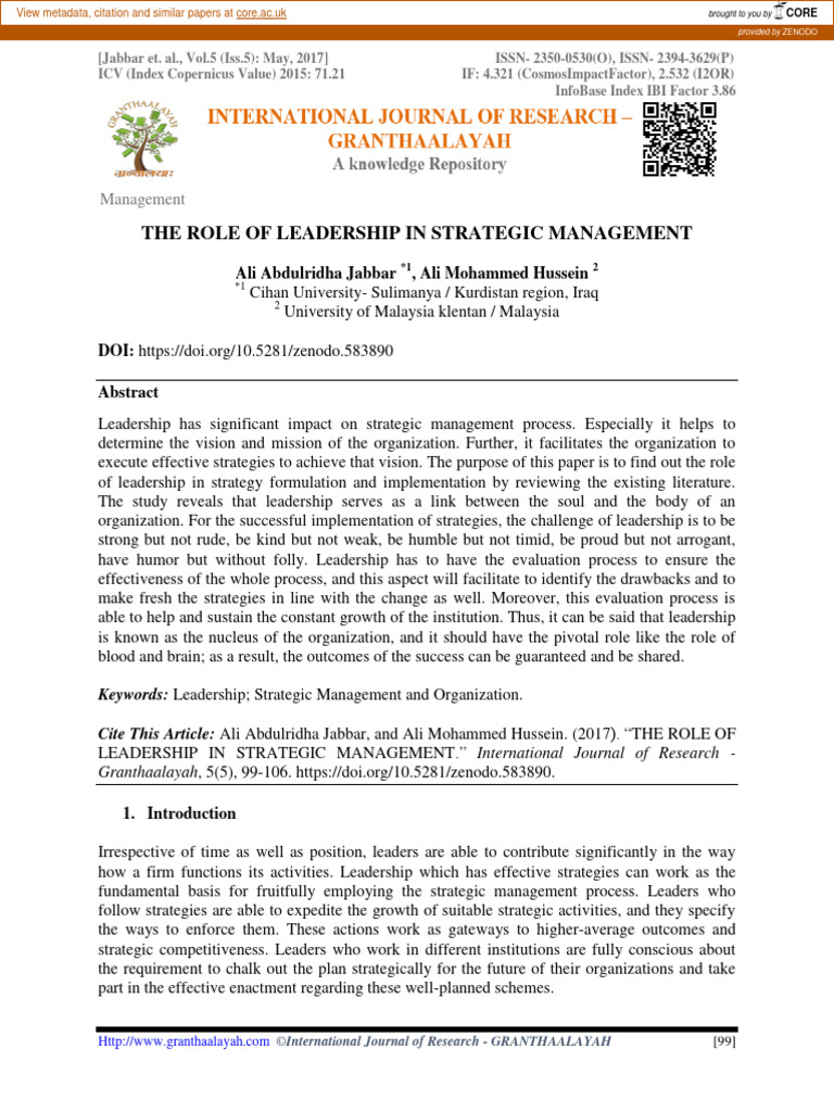 LEADERSHIP IN STRATEGIC MANAGEMENT.” International Journal of Research -