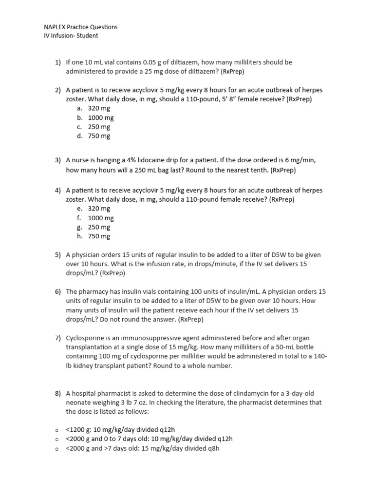 2) A patient is to receive acyclovir 5 mg/kg every 8 hours for an acute outbreak of herpes
