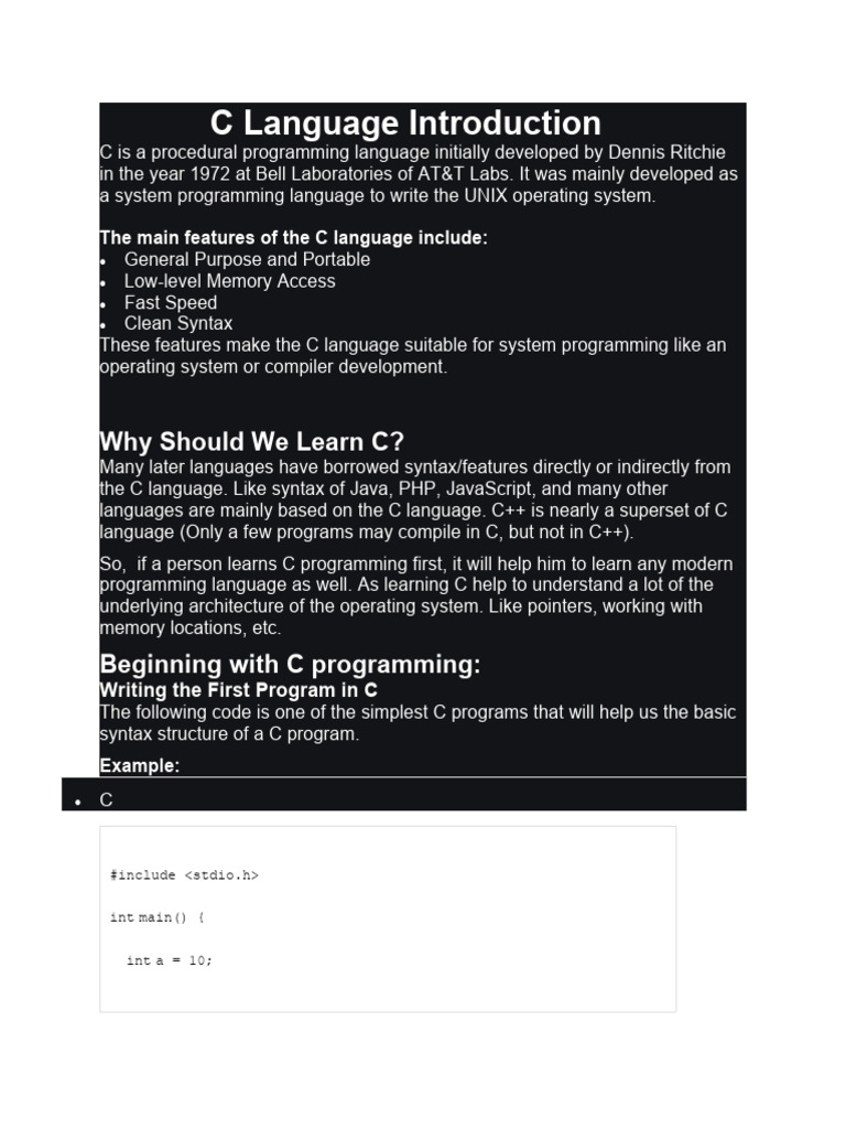C is a procedural programming language. It was initially developed by Dennis