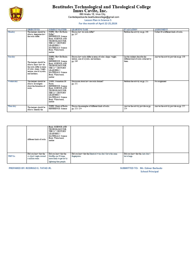Tuesday TOPIC: How Do Rocks Discuss how rocks differ in terms of color, shape, weight, Let the students describe the Answer the activity provide on pp. 250