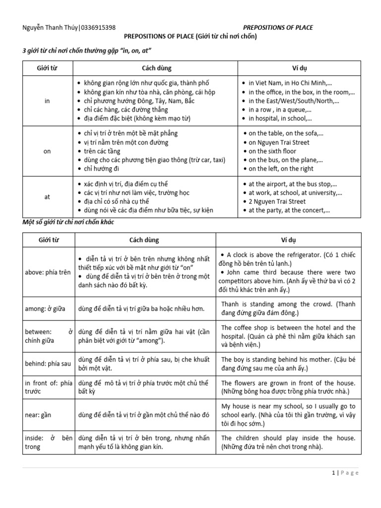 Nguyễn Thanh Thúy|0336915398 PREPOSITIONS OF PLACE