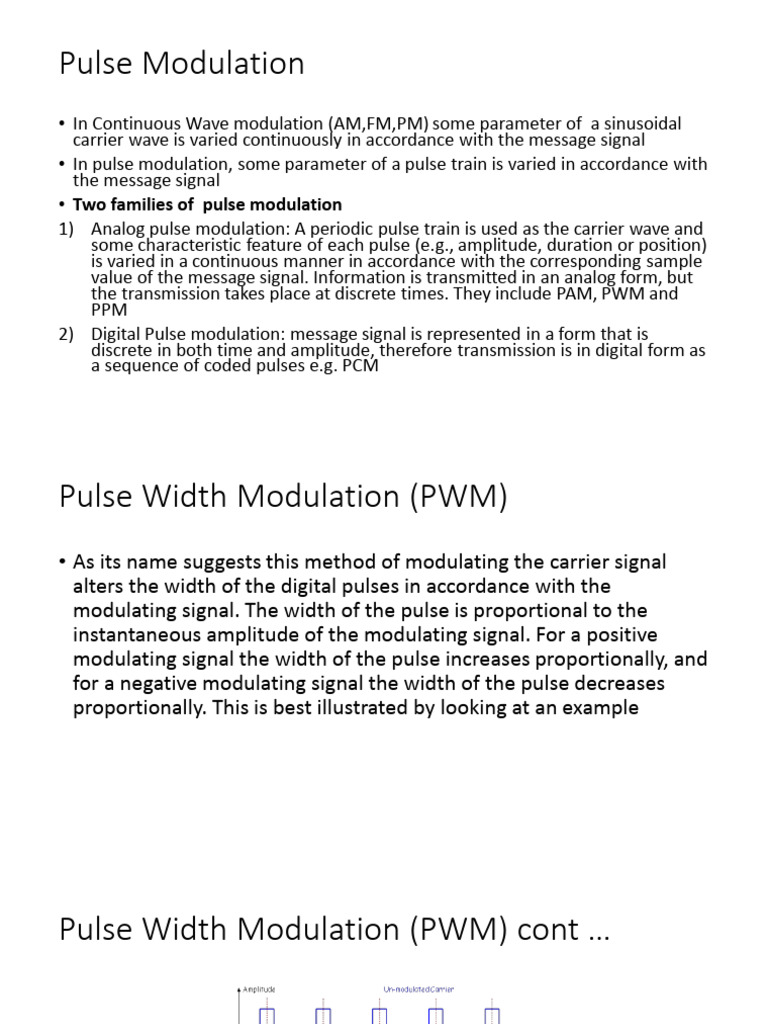1) Analog pulse modulation: A periodic pulse train is used as the carrier wave and