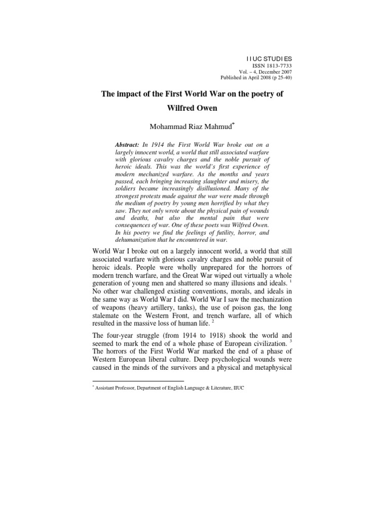 Abstract: In 1914 the First World War broke out on a largely innocent world, a world that still associated warfare with glorious cavalry charges and the noble pursuit of heroic ideals. This was the worlds first experience of modern mechanized warfare. As the months and years passed, each bringing increasing slaughter and misery, the soldiers became increasingly disillusioned. Many of the strongest protests made against the war were made through the medium of poetry by young men horrified by what they saw. They not only wrote about the physical pain of wounds and deaths, but also the mental pain that were consequences of war. One of these poets was Wilfred Owen. In his poetry we find the feelings of futility, horror, and dehumanization that he encountered in war.
