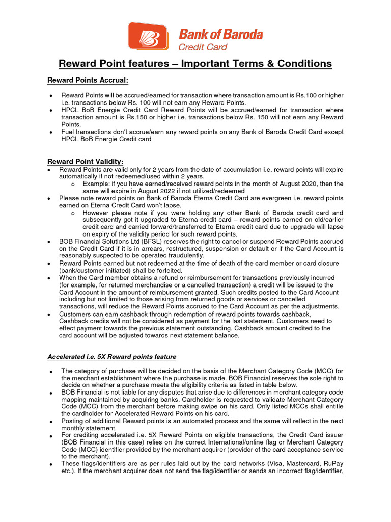 • Please note reward points on Bank of Baroda Eterna Credit Card are evergreen i.e. reward points
