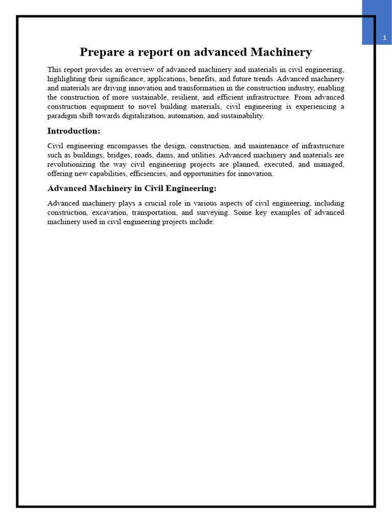 This report provides an overview of advanced machinery and materials in civil engineering,
