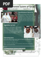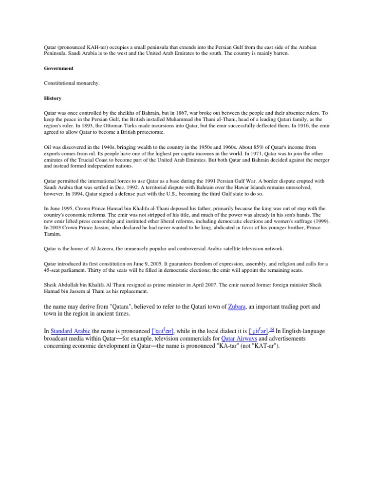 side of the Arabian Peninsula. Saudi Arabia is to the west and the United Arab Emirates to the south. The country is mainly barren. Government Constitutional monarchy. History Qatar was once controlled by the sheikhs of Bahrain, but in 1867, war broke out between the people and their absentee rulers. To keep the peace in the Persian Gulf, the British installed Muhammad ibn Thani al-Thani, head of a leading Qatari family, as the region's ruler. In 1893, the Ottoman Turks made incursions into Qatar, but the emir successfully deflected them. In 1916, the emir agreed to allow Qatar to become a British protectorate. Oil was discovered in the 1940s, bringing wealth to the country in the 1950s and 1960s. About 85% of Qatar's income from exports comes from oil. Its people have one of the highest per capita incomes in the world. In 1971, Qatar was to join the other emirates of the Trucial Coast to become part of the United Arab Emirates. But both Qatar and Bahrain decided against the merger and instead formed independent nations. Qatar permitted the international forces to use Qatar as a base during the 1991 Persian Gulf War. A border dispute erupted with Saudi Arabia that was settled in Dec. 1992. A territorial dispute with Bahrain over the Hawar Islands remains unresolved, however. In 1994, Qatar signed a defense pact with the U.S., becoming the third Gulf state to do so. In June 1995, Crown Prince Hamad bin Khalifa al-Thani deposed his father, primarily because the king was out of step with the country's economic reforms. The emir was not stripped of his title, and much of the power was already in his son's hands. The new emir lifted press censorship and instituted other liberal reforms, including democratic elections and women's suffrage (1999). In 2003 Crown Prince Jassim, who declared he had never wanted to be king, abdicated in favor of his younger brother, Prince Tamim. Qatar is the home of Al Jazeera, the immensely popular and controversial Arabic satellite television network. Qatar introduced its first constitution on June 9, 2005. It guarantees freedom of expression, assembly, and religion and calls for a 45-seat parliament. Thirty of the seats will be filled in democratic elections; the emir will appoint the remaining seats. Sheik Abdullah bin Khalifa Al Thani resigned as prime minister in April 2007. The emir named former foreign minister Sheik Hamad bin Jassem al Thani as his replacement.