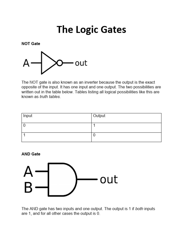 The AND gate has two inputs and one output. The output is 1 if both inputs
