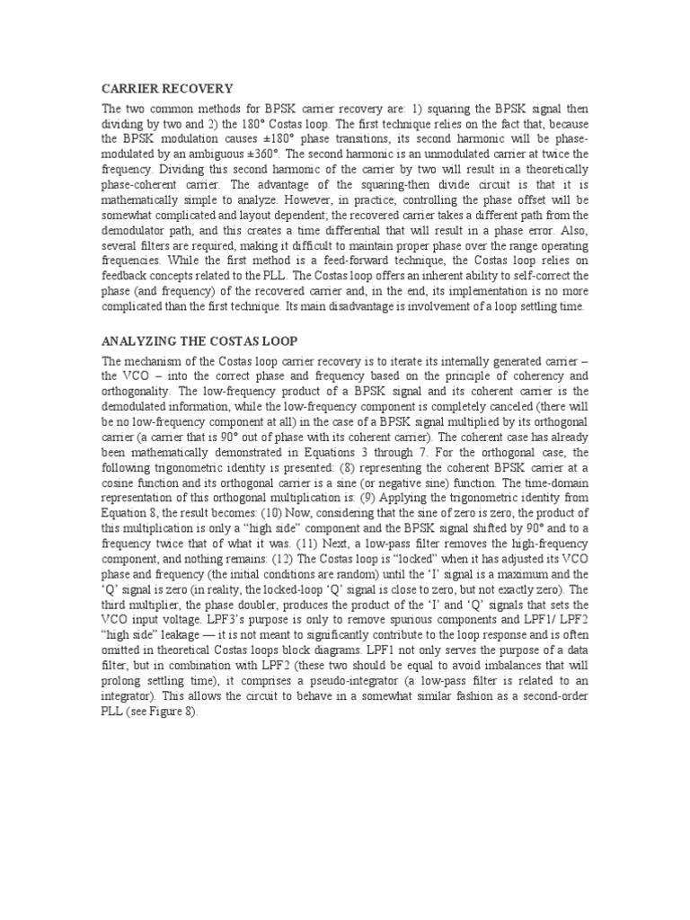 then dividing by two and 2) the 180 Costas loop. The first technique relies on the fact that, because the BPSK modulation causes 180 phase transitions, its second harmonic will be phasemodulated by an ambiguous 360. The second harmonic is an unmodulated carrier at twice the frequency. Dividing this second harmonic of the carrier by two will result in a theoretically phase-coherent carrier. The advantage of the squaring-then divide circuit is that it is mathematically simple to analyze. However, in practice, controlling the phase offset will be somewhat complicated and layout dependent; the recovered carrier takes a different path from the demodulator path, and this creates a time differential that will result in a phase error. Also, several filters are required, making it difficult to maintain proper phase over the range operating frequencies. While the first method is a feed-forward technique, the Costas loop relies on feedback concepts related to the PLL. The Costas loop offers an inherent ability to self-correct the phase (and frequency) of the recovered carrier and, in the end, its implementation is no more complicated than the first technique. Its main disadvantage is involvement of a loop settling time. ANALYZING THE COSTAS LOOP The mechanism of the Costas loop carrier recovery is to iterate its internally generated carrier the VCO into the correct phase and frequency based on the principle of coherency and orthogonality. The low-frequency product of a BPSK signal and its coherent carrier is the demodulated information, while the low-frequency component is completely canceled (there will be no low-frequency component at all) in the case of a BPSK signal multiplied by its orthogonal carrier (a carrier that is 90 out of phase with its coherent carrier). The coherent case has already been mathematically demonstrated in Equations 3 through 7. For the orthogonal case, the following trigonometric identity is presented: (8) representing the coherent BPSK carrier at a cosine function and its orthogonal carrier is a sine (or negative sine) function. The time-domain representation of this orthogonal multiplication is: (9) Applying the trigonometric identity from Equation 8, the result becomes: (10) Now, considering that the sine of zero is zero, the product of this multiplication is only a high side component and the BPSK signal shifted by 90 and to a frequency twice that of what it was. (11) Next, a low-pass filter removes the high-frequency component, and nothing remains: (12) The Costas loop is locked when it has adjusted its VCO phase and frequency (the initial conditions are random) until the I signal is a maximum and the Q signal is zero (in reality, the locked-loop Q signal is close to zero, but not exactly zero). The third multiplier, the phase doubler, produces the product of the I and Q signals that sets the VCO input voltage. LPF3s purpose is only to remove spurious components and LPF1/ LPF2 high side leakage it is not meant to significantly contribute to the loop response and is often omitted in theoretical Costas loops block diagrams. LPF1 not only serves the purpose of a data filter, but in combination with LPF2 (these two should be equal to avoid imbalances that will prolong settling time), it comprises a pseudo-integrator (a low-pass filter is related to an integrator). This allows the circuit to behave in a somewhat similar fashion as a second-order PLL (see Figure 8).