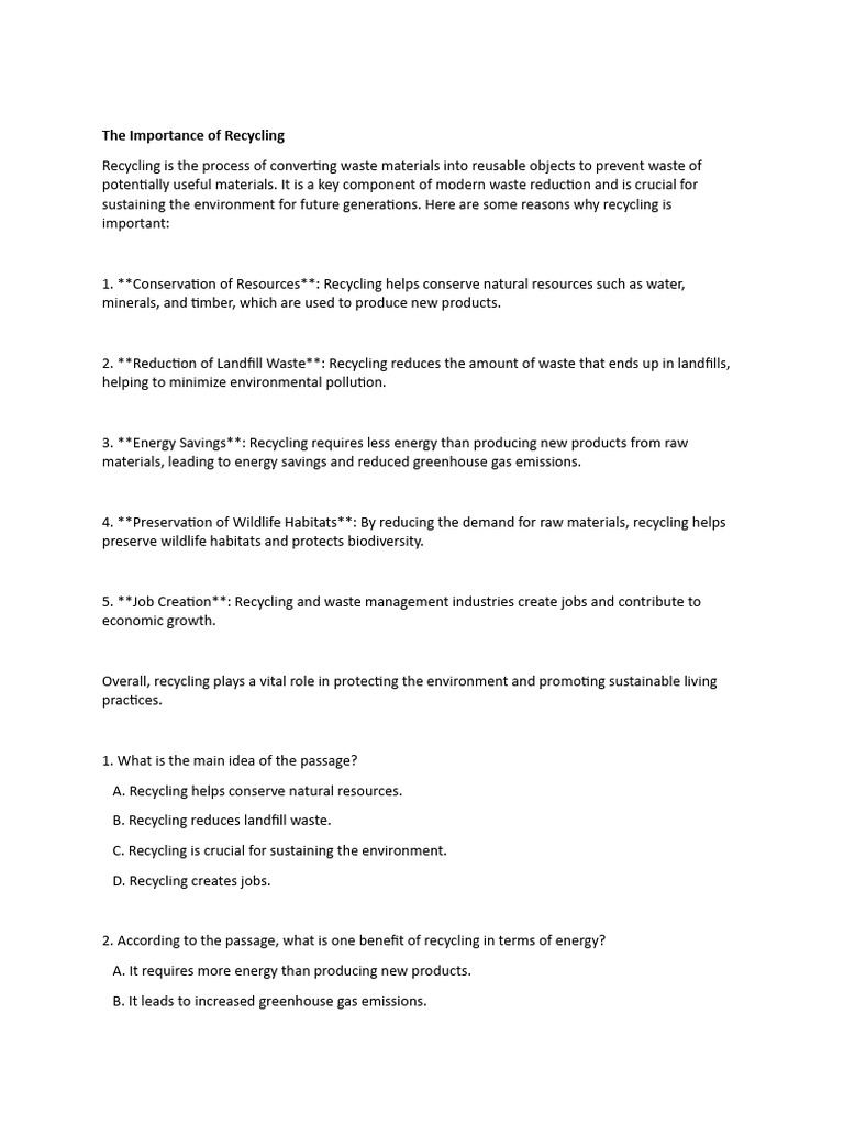 1. **Conservation of Resources**: Recycling helps conserve natural resources such as water,