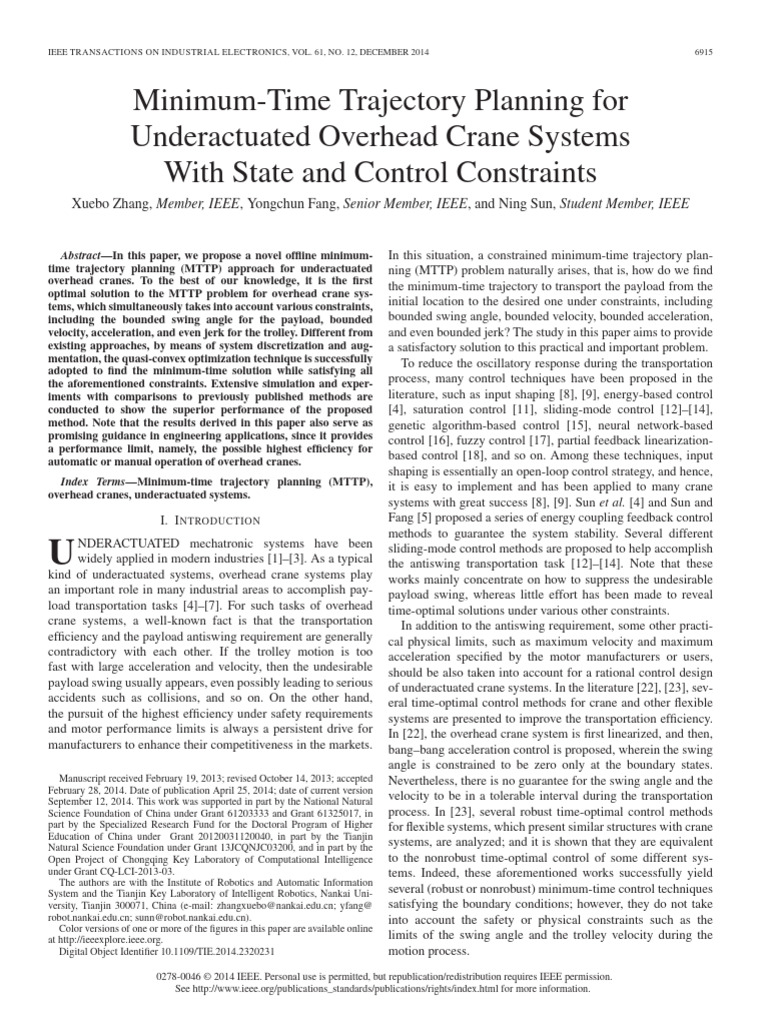 ZHANG et al.: MTTP FOR OVERHEAD CRANE SYSTEMS WITH STATE AND CONTROL CONSTRAINTS 6925