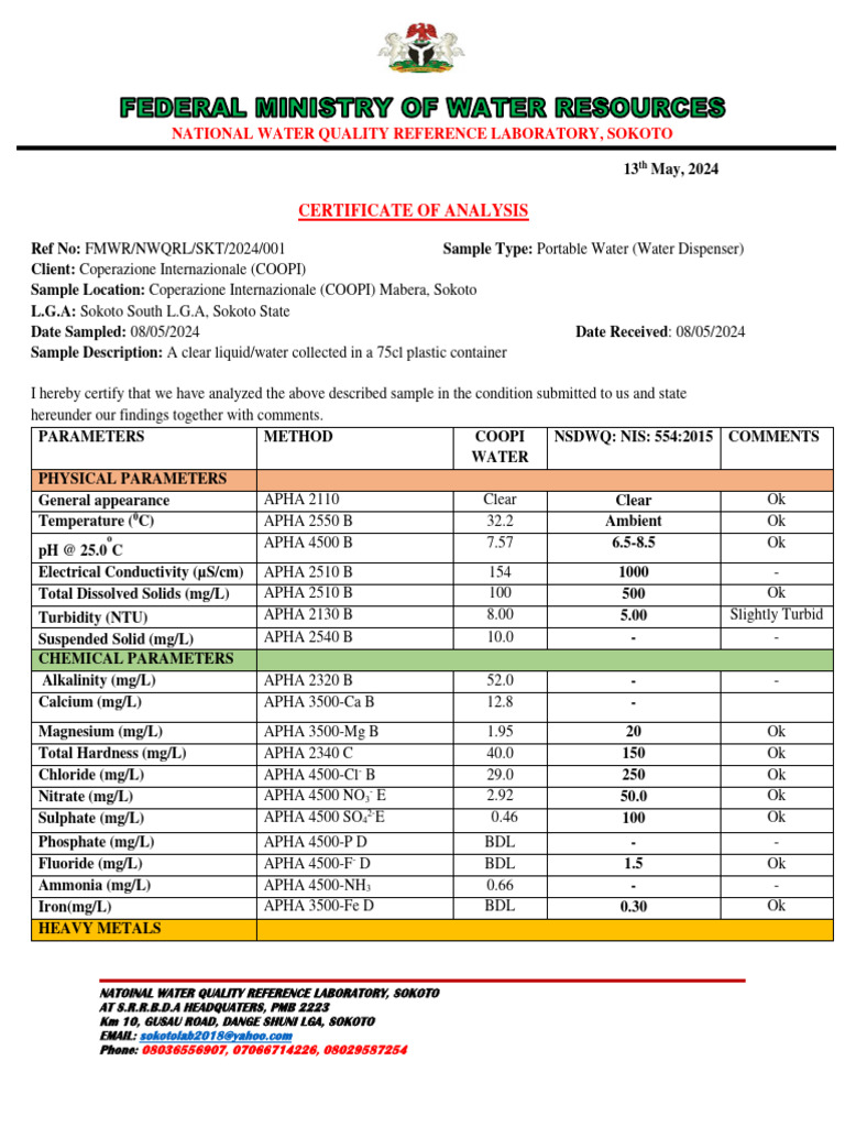 Ref No: FMWR/NWQRL/SKT/2024/001 Sample Type: Portable Water (Water Dispenser)