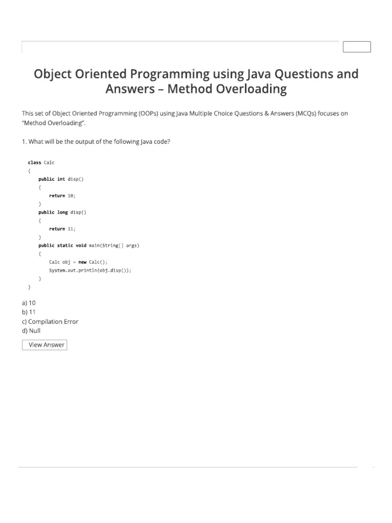 0 ratings0% found this document useful (0 votes) 80 views14 pagesMethod Overloading - Java OOPs Questions and Answers - Sanfoundry