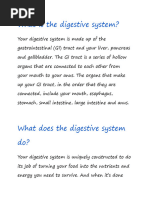 the first bite of food. Chewing breaks the food into pieces that are more easily digested, while saliva mixes with food to begin the process of breaking it down into a form your body can absorb and use. Esophagus Located in your throat near your trachea (windpipe), the esophagus receives food from your mouth when you swallow. By means of a series of muscular contractions called peristalsis, the esophagus delivers food to your stomach. Stomach The stomach is a hollow organ, or "container," that holds food while it is being mixed with enzymes that continue the process of breaking down food into a usable form. Cells in the lining of the stomach secrete a strong acid and powerful enzymes that are responsible for the breakdown process. When the contents of the stomach are sufficiently processed, they are released into the small intestine. Small intestine Made up of three segments the duodenum, jejunum, and ileum the small intestine is a 22-foot long muscular tube that breaks down food using enzymes released by the pancreas and bile from the liver. Peristalsis also is at work in this organ, moving food through and mixing it with digestive secretions from the pancreas and liver. The duodenum is largely responsible for the continuous breaking-down process, with the jejunum and ileum mainly responsible for absorption of nutrients into the bloodstream. Contents of the small intestine start out semi-solid, and end in a liquid form after passing through the organ. Water, bile, enzymes, and mucous contribute to the change in consistency. Once the nutrients have been absorbed and the leftover-food residue liquid has passed through the small intestine, it then moves on to the large intestine, or colon. Pancreas The pancreas secretes digestive enzymes into the duodenum, the first segment of the small intestine. These enzymes break down protein, fats, and carbohydrates. The pancreas also makes insulin, secreting it directly into the bloodstream. Insulin is the chief hormone for metabolizing sugar. Liver The liver has multiple functions, but its main function within the digestive system is to process the nutrients absorbed from the small intestine. Bile from the liver secreted into the small intestine also plays an important role in digesting fat. In addition, the liver is the bodys chemical "factory." It takes the raw materials absorbed by the intestine and makes all the various chemicals the body needs to function. The liver also detoxifies potentially harmful chemicals. It breaks down and secretes many drugs. Gallbladder The gallbladder stores and concentrates bile, and then releases it into the duodenum to help absorb and digest fats. Colon (large intestine) The colon is a 6-foot long muscular tube that connects the small intestine to the rectum. The large intestine is made up of the cecum, the ascending (right) colon, the transverse (across) colon, the descending (left) colon, and the sigmoid colon, which connects to the rectum. The appendix is a small tube attached to the cecum. The large intestine is a highly specialized organ that is
