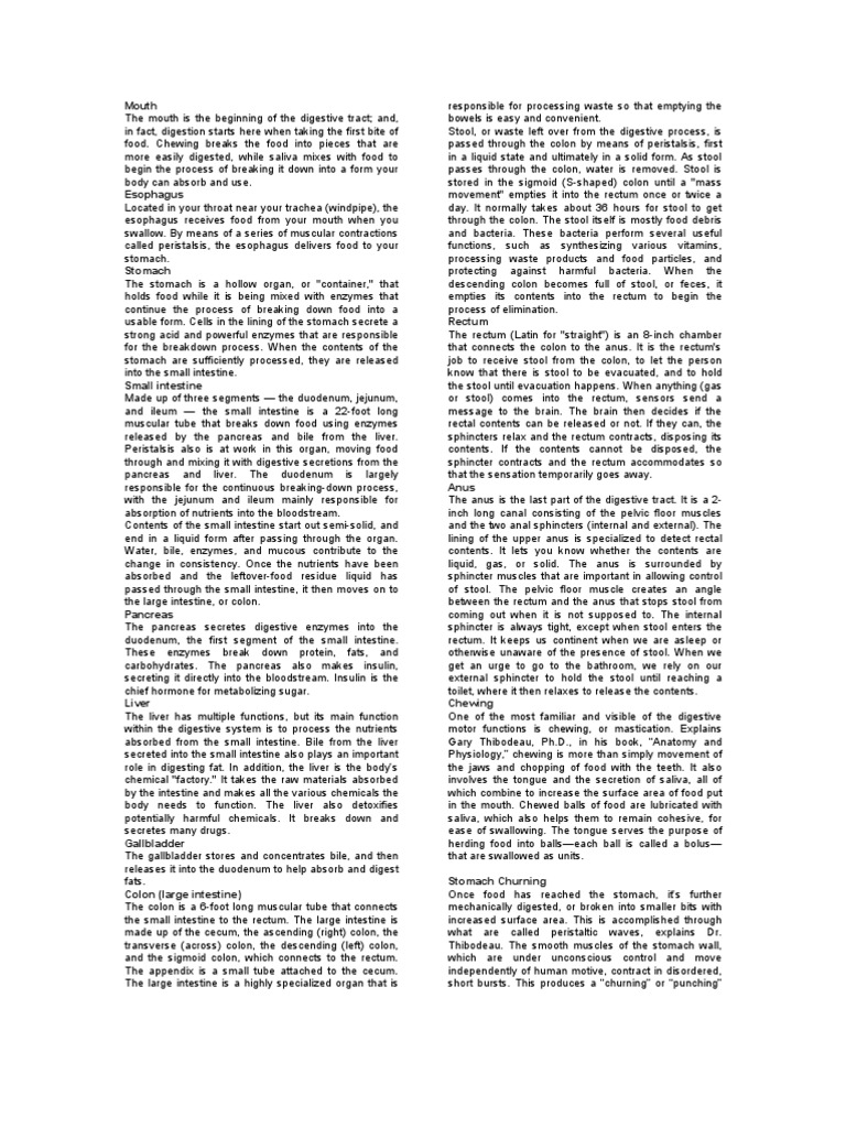 responsible for processing waste so that emptying the bowels is easy and convenient. Stool, or waste left over from the digestive process, is passed through the colon by means of peristalsis, first in a liquid state and ultimately in a solid form. As stool passes through the colon, water is removed. Stool is stored in the sigmoid (S-shaped) colon until a "mass movement" empties it into the rectum once or twice a day. It normally takes about 36 hours for stool to get through the colon. The stool itself is mostly food debris and bacteria. These bacteria perform several useful functions, such as synthesizing various vitamins, processing waste products and food particles, and protecting against harmful bacteria. When the descending colon becomes full of stool, or feces, it empties its contents into the rectum to begin the process of elimination. Rectum The rectum (Latin for "straight") is an 8-inch chamber that connects the colon to the anus. It is the rectum's job to receive stool from the colon, to let the person know that there is stool to be evacuated, and to hold the stool until evacuation happens. When anything (gas or stool) comes into the rectum, sensors send a message to the brain. The brain then decides if the rectal contents can be released or not. If they can, the sphincters relax and the rectum contracts, disposing its contents. If the contents cannot be disposed, the sphincter contracts and the rectum accommodates so that the sensation temporarily goes away. Anus The anus is the last part of the digestive tract. It is a 2inch long canal consisting of the pelvic floor muscles and the two anal sphincters (internal and external). The lining of the upper anus is specialized to detect rectal contents. It lets you know whether the contents are liquid, gas, or solid. The anus is surrounded by sphincter muscles that are important in allowing control of stool. The pelvic floor muscle creates an angle between the rectum and the anus that stops stool from coming out when it is not supposed to. The internal sphincter is always tight, except when stool enters the rectum. It keeps us continent when we are asleep or otherwise unaware of the presence of stool. When we get an urge to go to the bathroom, we rely on our external sphincter to hold the stool until reaching a toilet, where it then relaxes to release the contents. Chewing One of the most familiar and visible of the digestive motor functions is chewing, or mastication. Explains Gary Thibodeau, Ph.D., in his book, Anatomy and Physiology, chewing is more than simply movement of the jaws and chopping of food with the teeth. It also involves the tongue and the secretion of saliva, all of which combine to increase the surface area of food put in the mouth. Chewed balls of food are lubricated with saliva, which also helps them to remain cohesive, for ease of swallowing. The tongue serves the purpose of herding food into ballseach ball is called a bolus that are swallowed as units. Stomach Churning Once food has reached the stomach, its further mechanically digested, or broken into smaller bits with increased surface area. This is accomplished through what are called peristaltic waves, explains Dr. Thibodeau. The smooth muscles of the stomach wall, which are under unconscious control and move independently of human motive, contract in disordered, short bursts. This produces a churning or punching