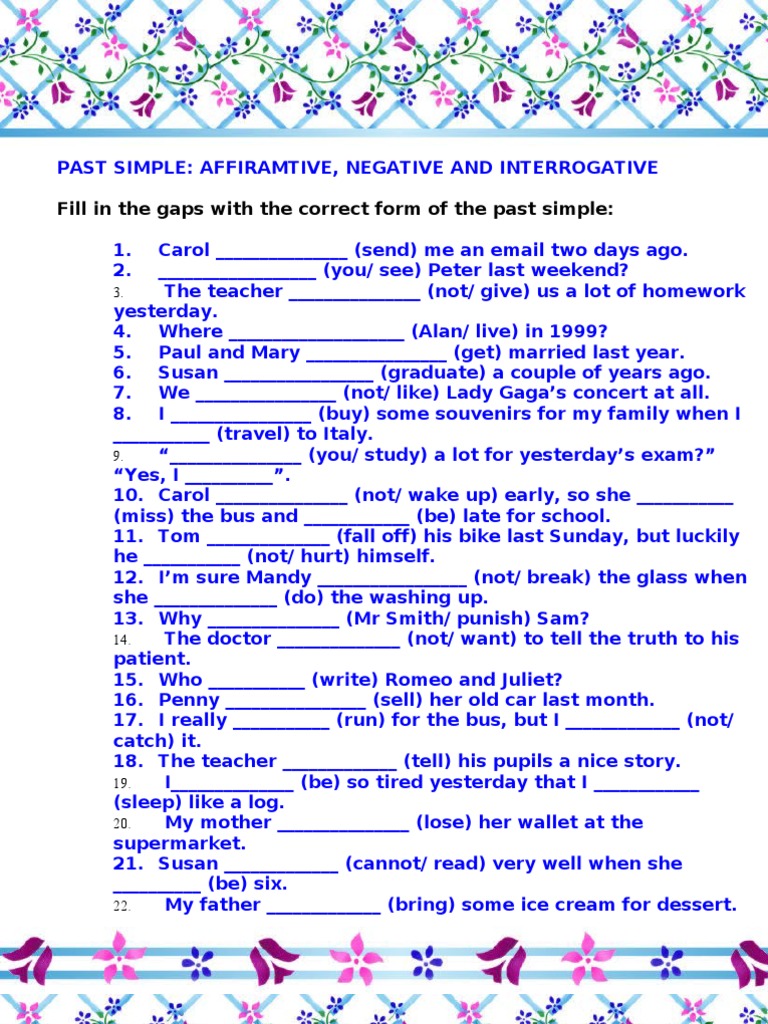 simple: 1. 2. Carol _______________ (send) me an email two days ago. __________________ (you/ see) Peter last weekend? 3. The teacher _______________ (not/ give) us a lot of homework yesterday. 4. Where ____________________ (Alan/ live) in 1999? 5. Paul and Mary ________________ (get) married last year. 6. Susan _________________ (graduate) a couple of years ago. 7. We ________________ (not/ like) Lady Gagas concert at all. 8. I ________________ (buy) some souvenirs for my family when I ___________ (travel) to Italy. 9. _______________ (you/ study) a lot for yesterdays exam? Yes, I __________. 10. Carol _______________ (not/ wake up) early, so she ___________ (miss) the bus and ____________ (be) late for school. 11. Tom ______________ (fall off) his bike last Sunday, but luckily he ___________ (not/ hurt) himself. 12. Im sure Mandy _________________ (not/ break) the glass when she ______________ (do) the washing up. 13. Why _______________ (Mr Smith/ punish) Sam? 14. The doctor ______________ (not/ want) to tell the truth to his patient. 15. Who ___________ (write) Romeo and Juliet? 16. Penny ________________ (sell) her old car last month. 17. I really ___________ (run) for the bus, but I _____________ (not/ catch) it. 18. The teacher _____________ (tell) his pupils a nice story. 19. I______________ (be) so tired yesterday that I ____________ (sleep) like a log. 20. My mother _______________ (lose) her wallet at the supermarket. 21. Susan _____________ (cannot/ read) very well when she __________ (be) six. 22. My father _____________ (bring) some ice cream for dessert.