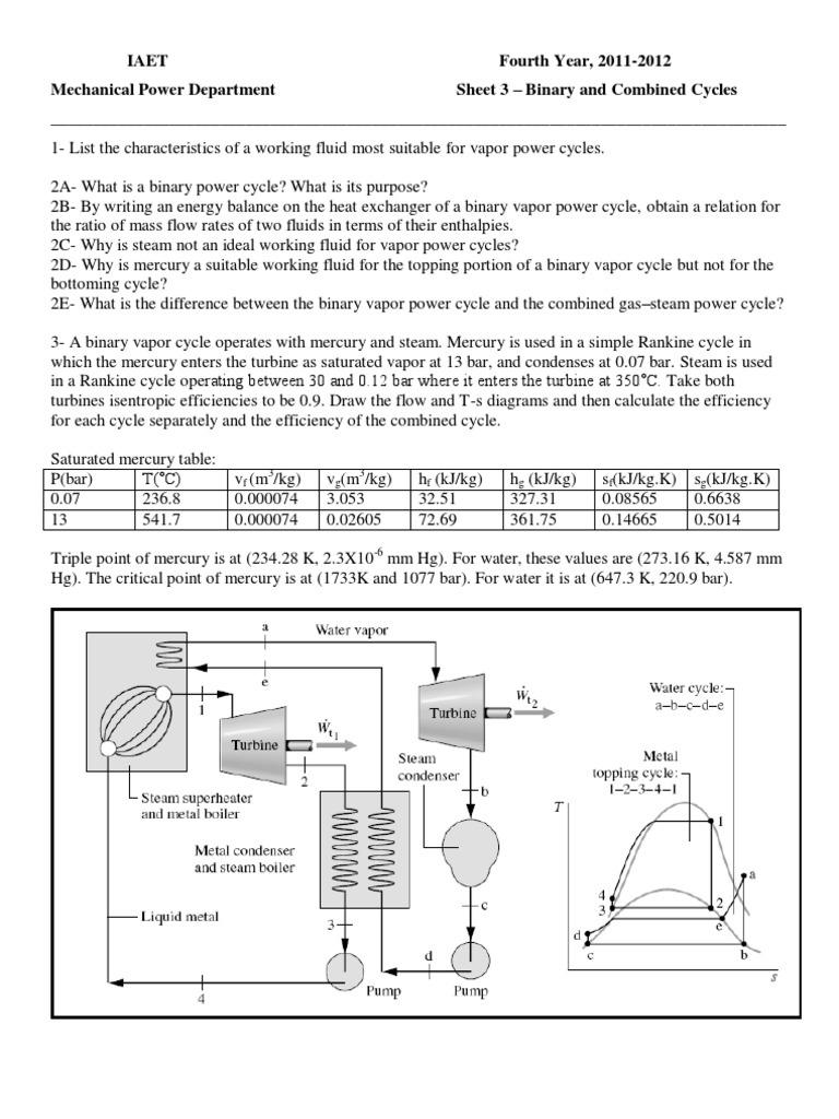 Fourth Year, 2011-2012 Sheet 3 Binary and Combined Cycles