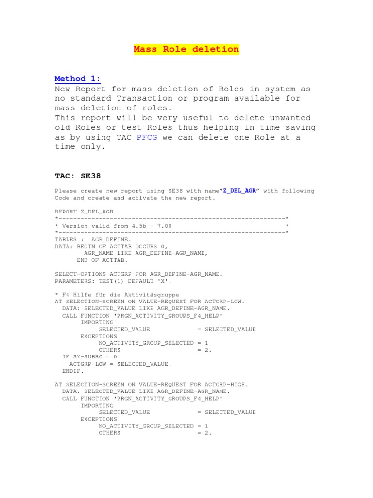 This report will be very useful to delete unwanted old roles or test roles thus helping in time saving as by using TAC PFCG we can delete one role at a time only. TAC: SE38 Please create New Report using SE38 with name"Z_DEL_AGR" with following Code and create and activate the new report.