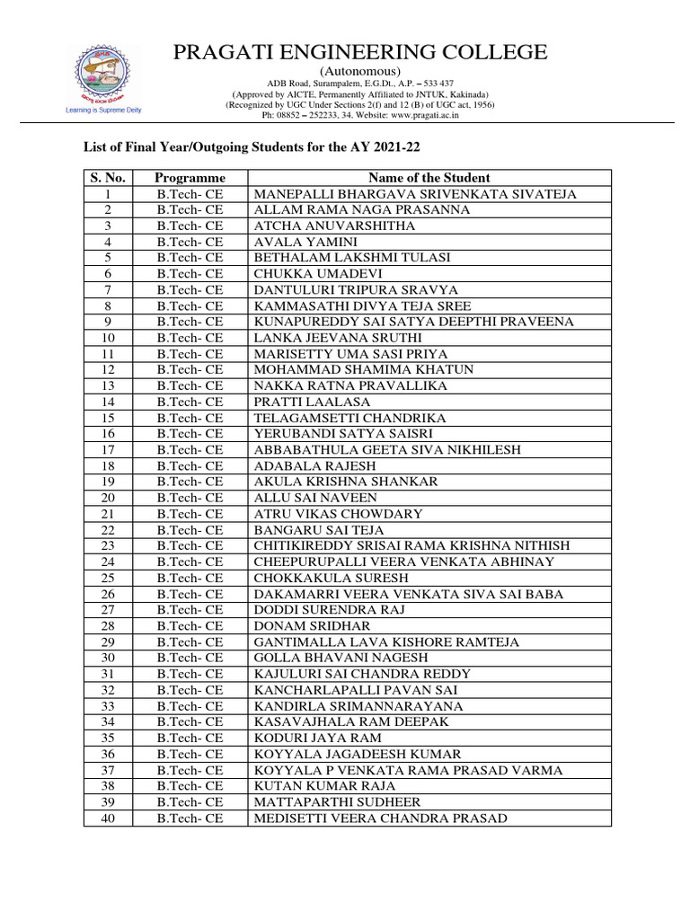 Ph: 08852 – 252233, 34. Website: www.pragati.ac.in