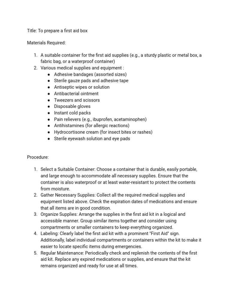 1. A suitable container for the first aid supplies (e.g., a sturdy plastic or metal box, a