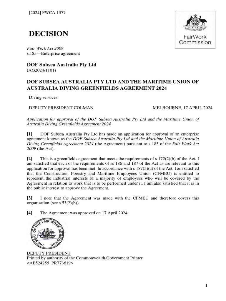 Application for approval of the DOF Subsea Australia Pty Ltd and the Maritime Union of