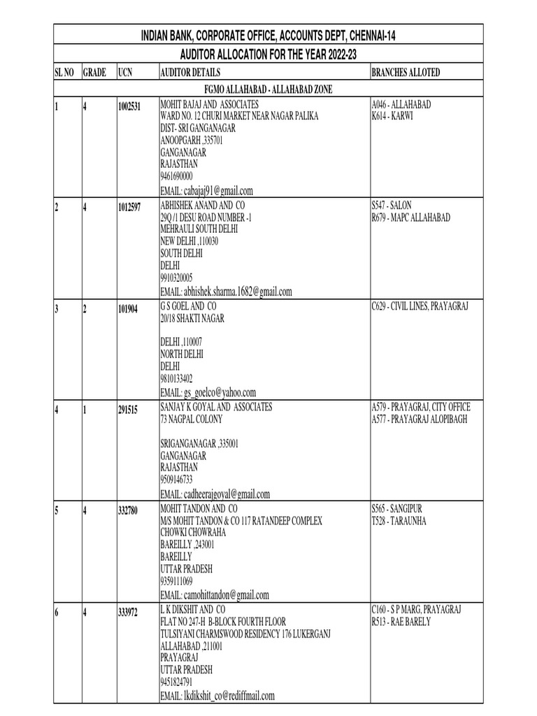 Indian Bank, Corporate Office, Accounts Dept, Chennai-14 Auditor Allocation For The Year 2022-23