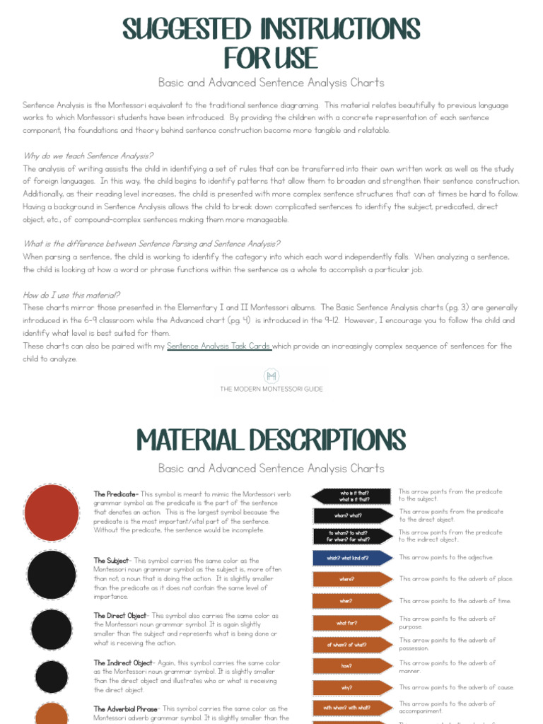 These charts mirror those presented in the Elementary I and II Montessori albums. The Basic Sentence Analysis charts (pg. 3) are generally